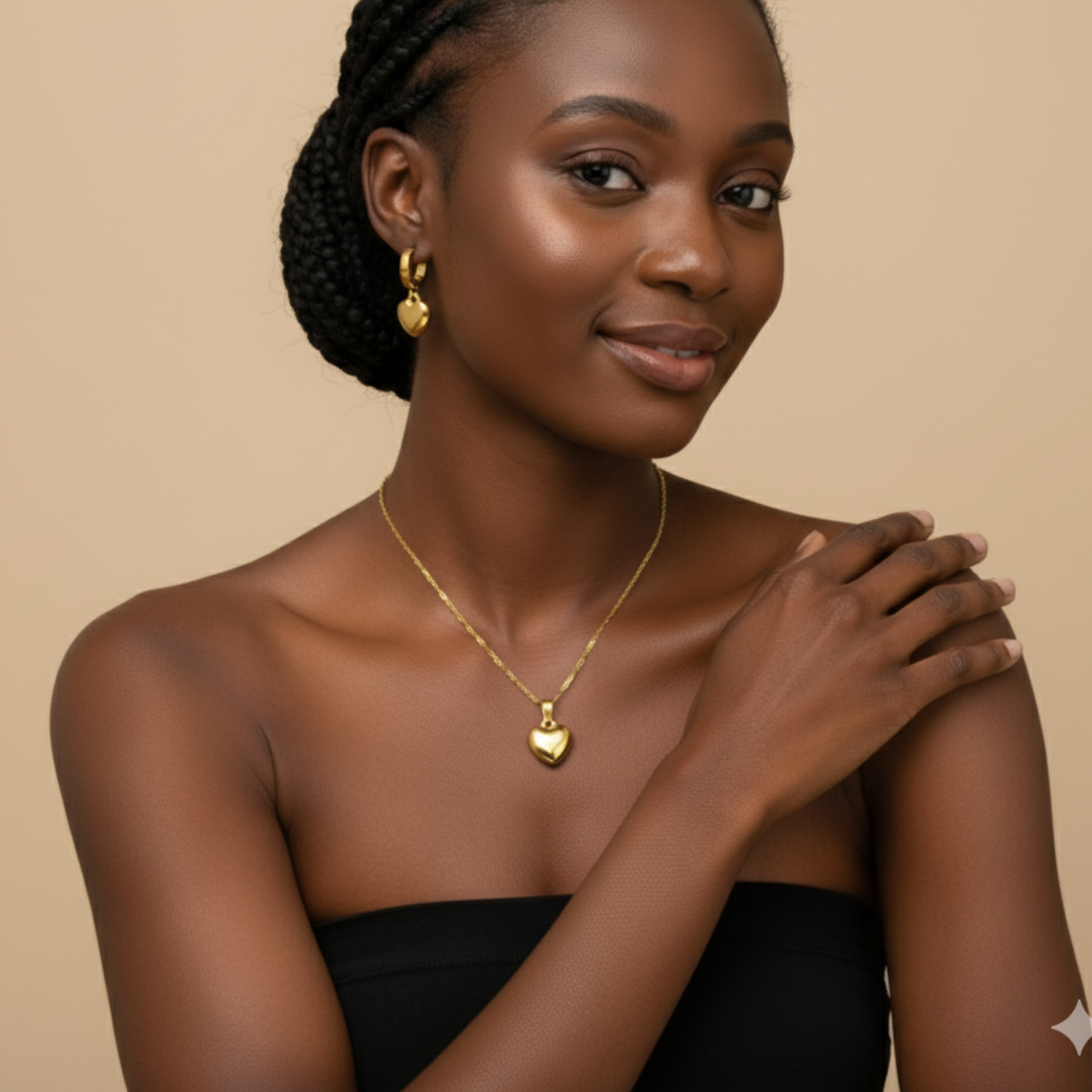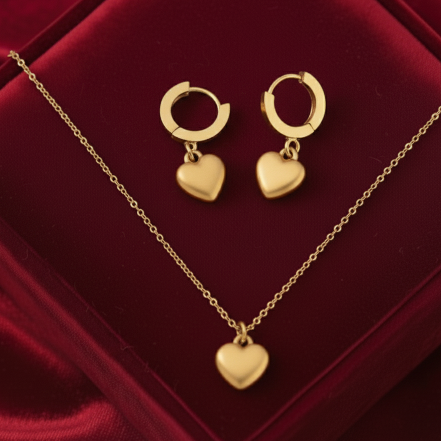 Aura, ensemble de boucles d'oreilles et collier de mode pour femmes présente de l'acier inoxydable plaqué or 18 carats avec un design intemporel en forme de cœur, idéal pour les mariages, les soirées et les cadeaux. L'ensemble comprend un collier et des boucles d'oreilles, conçus pour leur durabilité et leur élégance. Adapté à diverses occasions, il allie style tendance et praticité, assurant beauté durable et polyvalence.