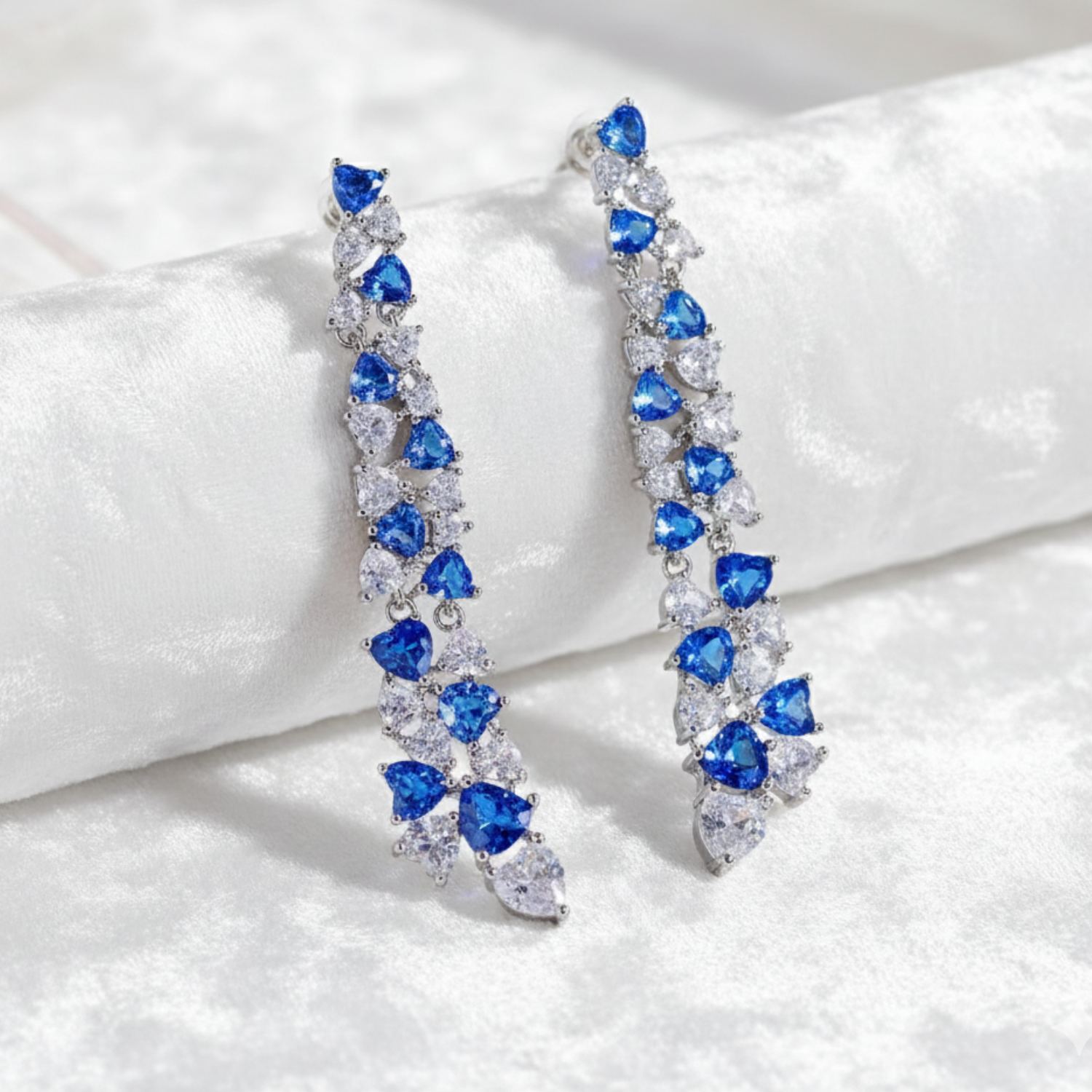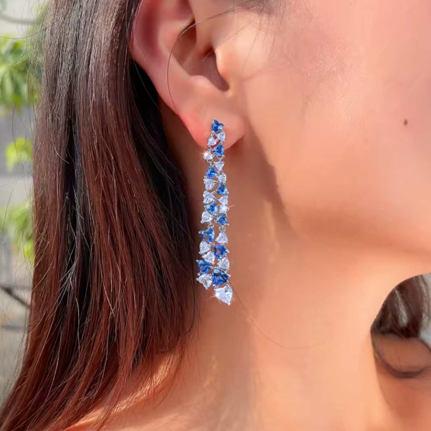 Ces boucles d'oreilles en zircone cubique taillée en forme de cœur sont fabriquées avec une coupe cœur et flèches, offrant un éclat exceptionnel. Fabriquées en cuivre plaqué rhodium, elles garantissent durabilité et finition haut de gamme. Conçues pour les femmes, ces boucles d'oreilles pendantes bleu royal sont parfaites pour les fêtes, mariages et banquets, alliant élégance et design géométrique tendance.