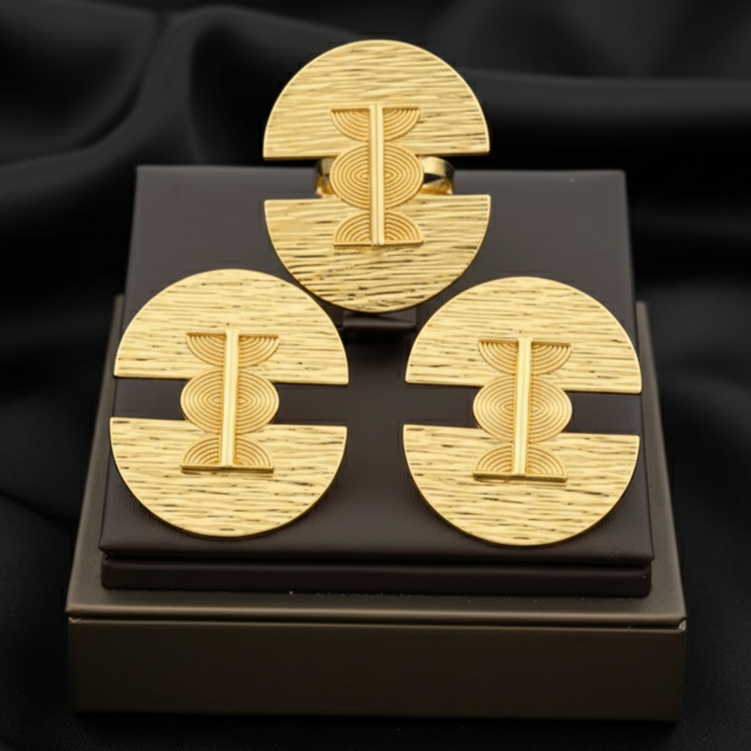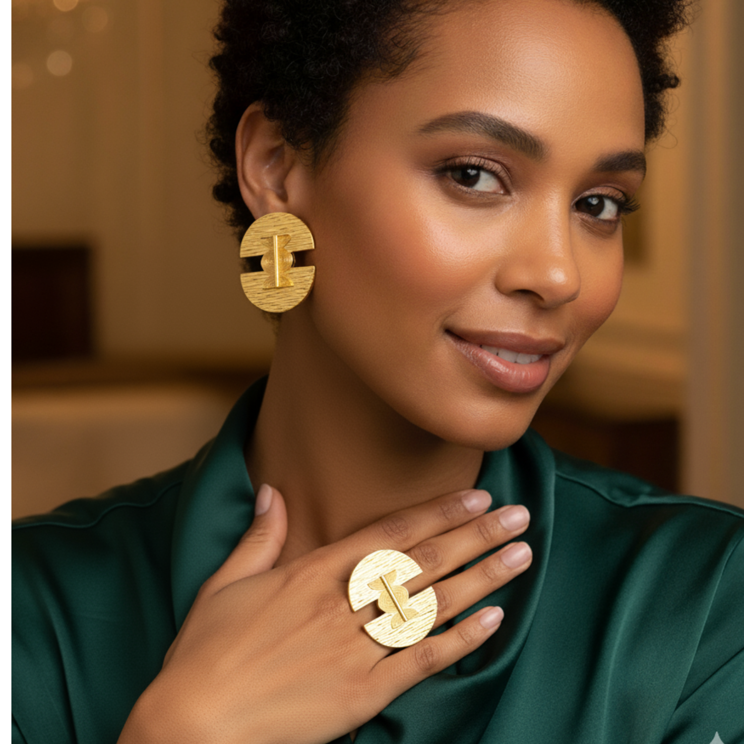 Cet ensemble sophistiqué, comprenant une bague statement et des boucles d'oreilles assorties, est la définition du chic moderne. Inspiré des motifs tribaux et des lignes architecturales, chaque pièce présente un design circulaire audacieux rehaussé d'une texture martelée et d'un motif central en forme de 'I' ou de sablier. Fabriqué en cuivre de haute qualité et somptueusement plaqué or 18 carat, cet ensemble apporte une touche de luxe et d'originalité à toutes vos tenues. Idéal pour celles qui aiment les bijoux qui racontent une histoire.