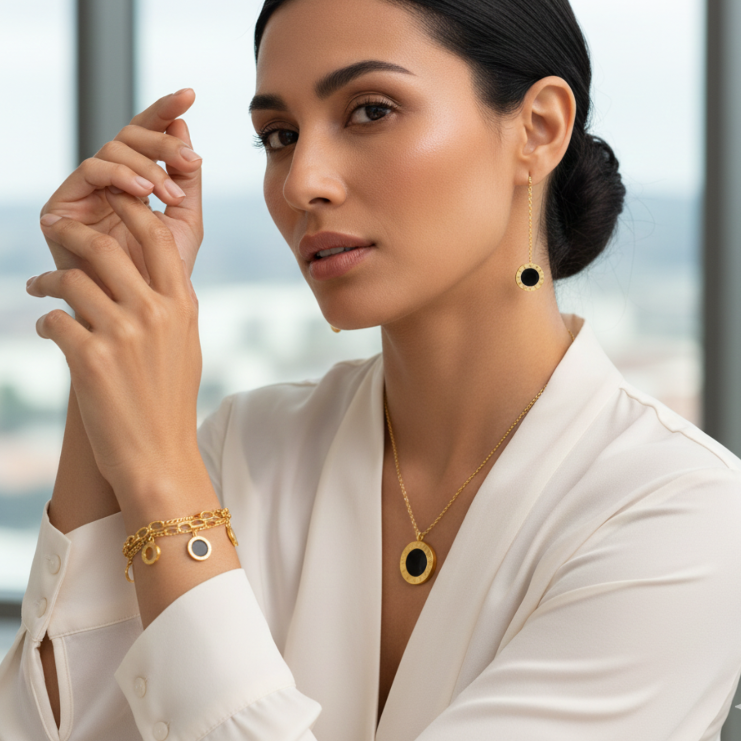 Affirmez votre style avec l'éclat prestigieux d'IMPERIA. Conçue pour la femme qui assume son élégance, cette parure mariant l’iconique design chiffres romains et une finition dorée luxueuse est bien plus qu'un accessoire : c'est une déclaration de mode.